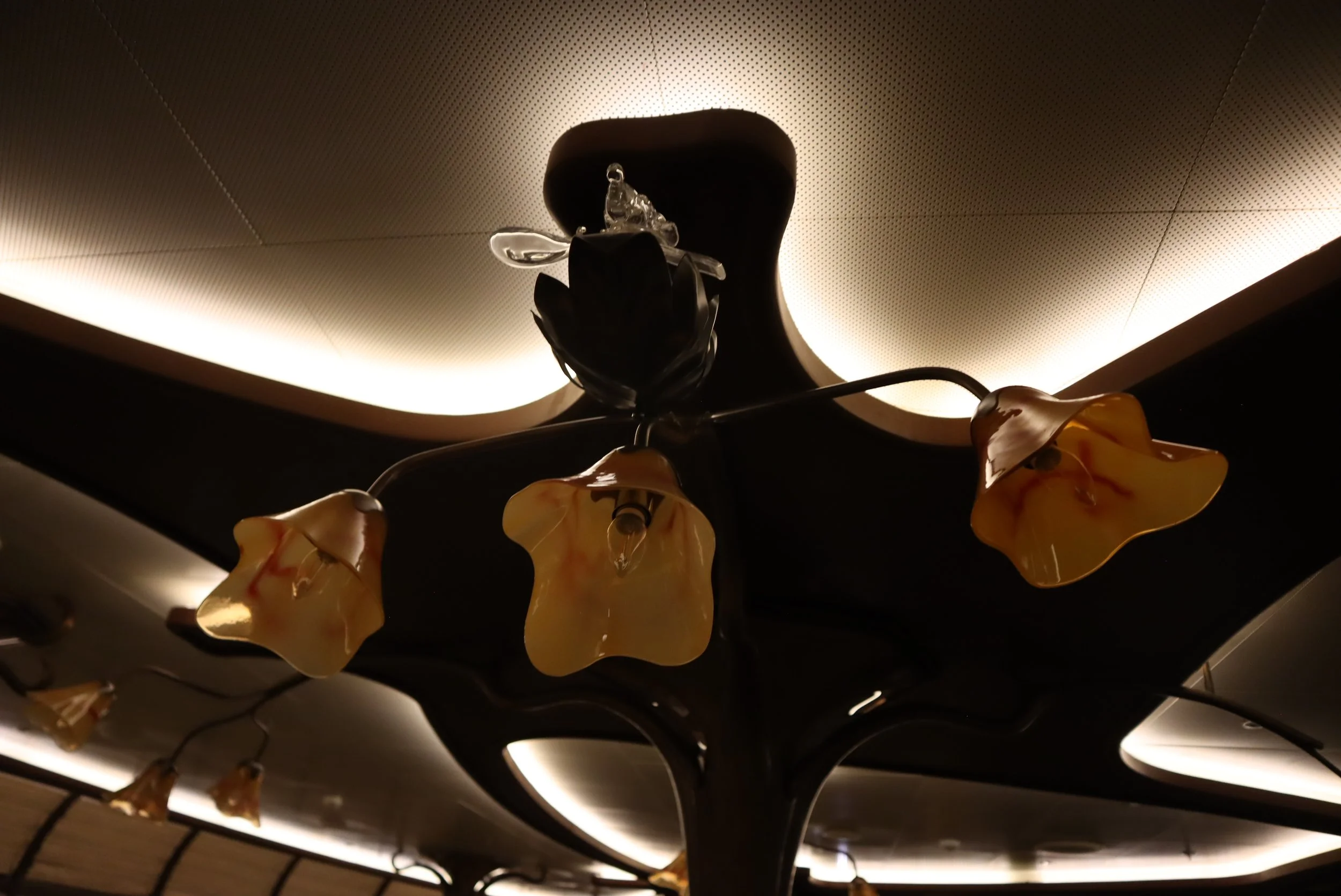 Lighting Fixtures: Above the tables, ornate chandelier-style lights incorporate Remy's shape in the metalwork or glass cutouts, especially noticeable when illuminated.