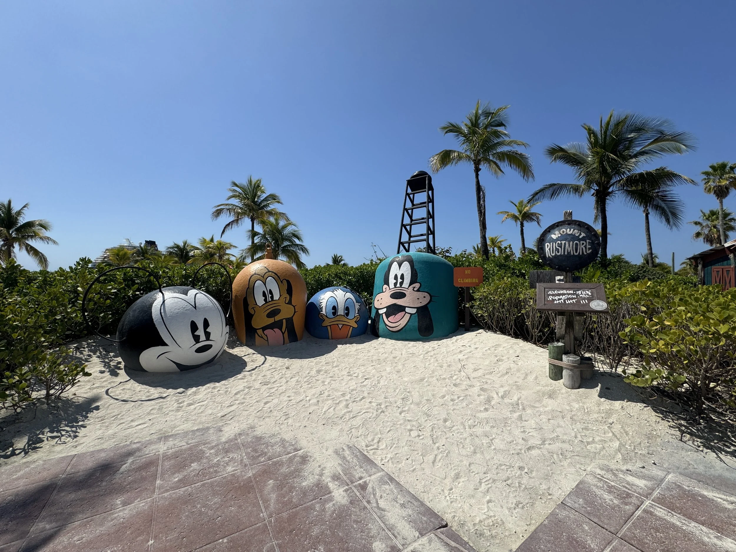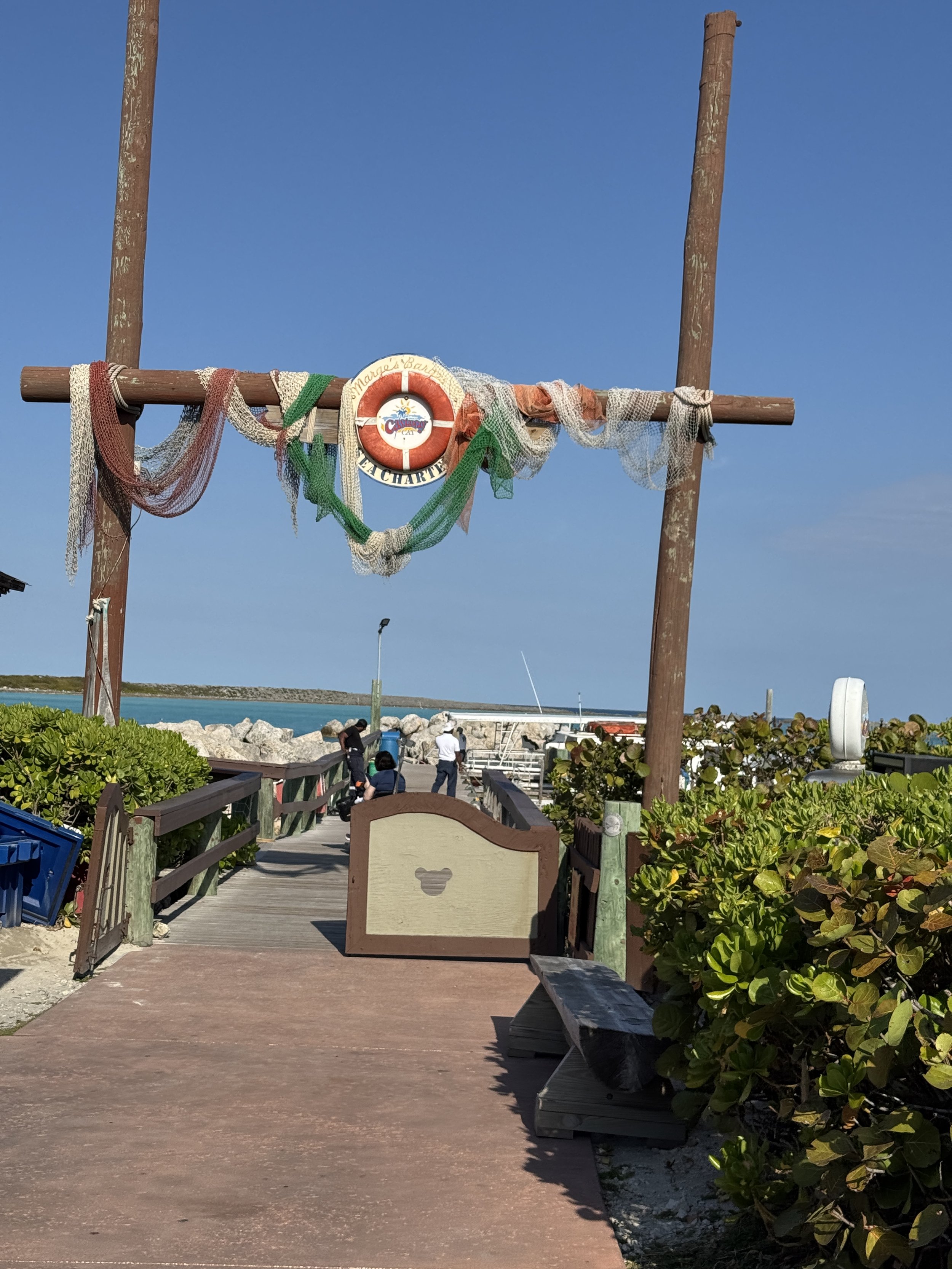 Docks right at the island, allowing Disney cruisers to simply walk off the ship directly onto this island with beautiful white sand beaches and clear turquoise waters