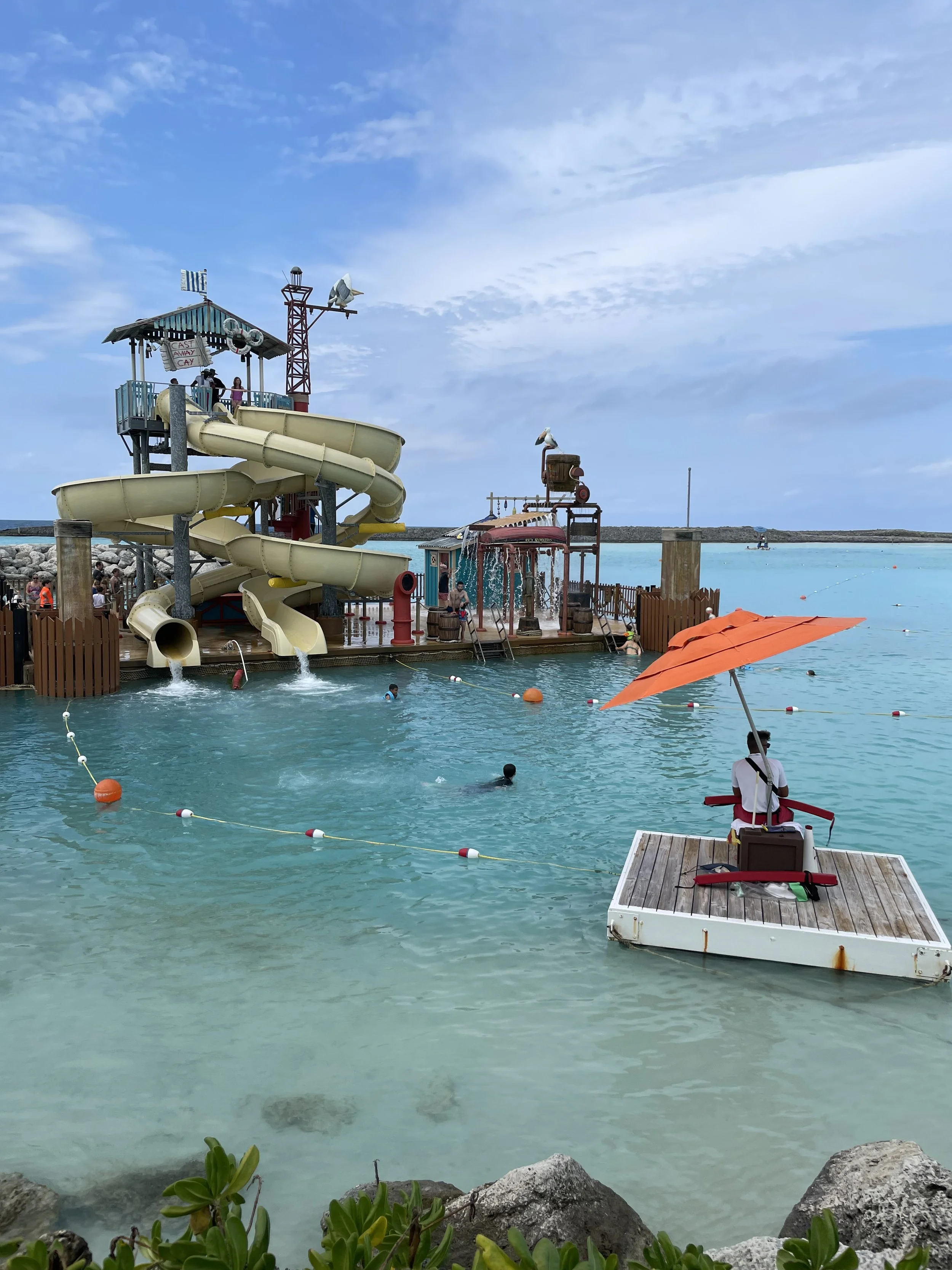 Castaway family beach is huge split into two, lots of chairs and hammocks, Pelican Plunge out in the water and has slides, kids must wear life jacket and swim out to it