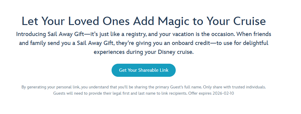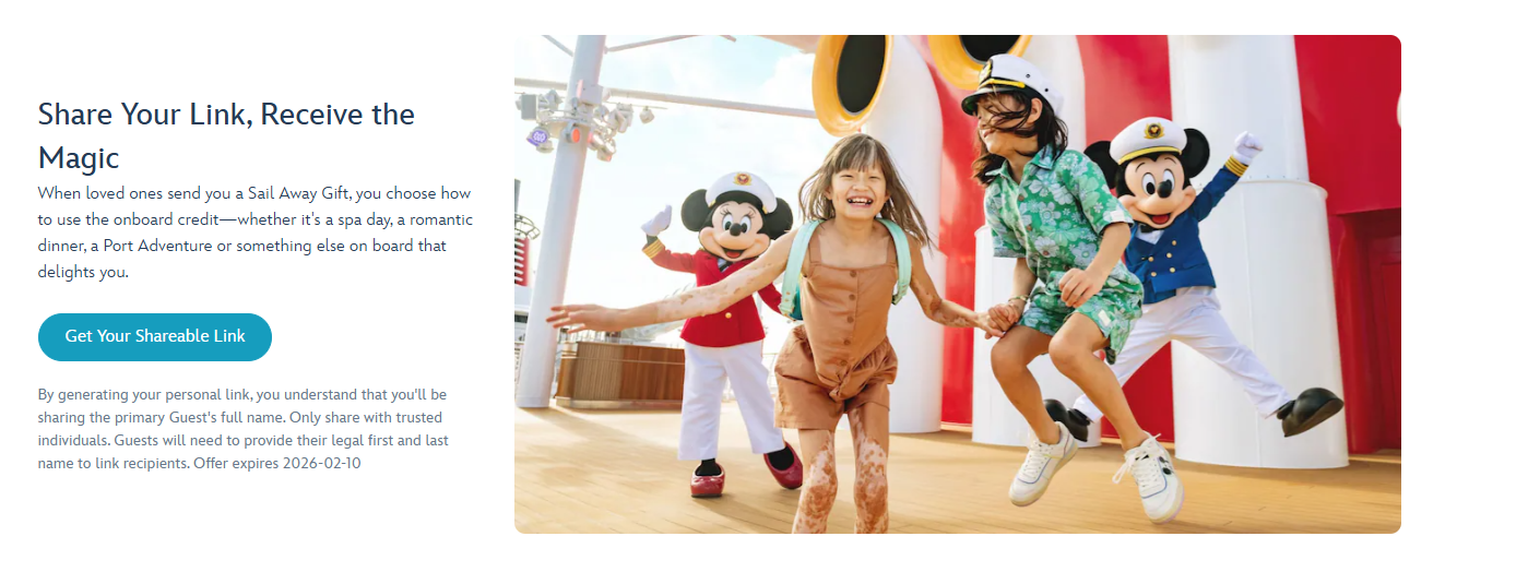 Once your loved ones receive your link, they can send you a Sail Away Gift—giving you onboard credit you can use on your Disney Cruise Line vacation. All they need to do is choose an amount, make the purchase and their generous gift will help create even more magical memories at sea.