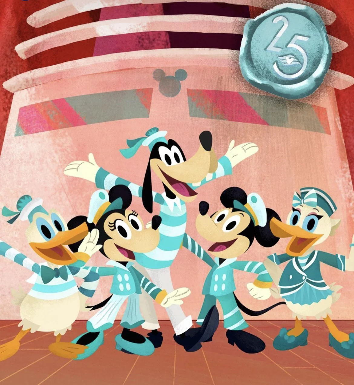 Disney Cruise Line logo, with a Mickey head set against three waves, is in the “25.” “Disney Cruise Line” is across the bottom