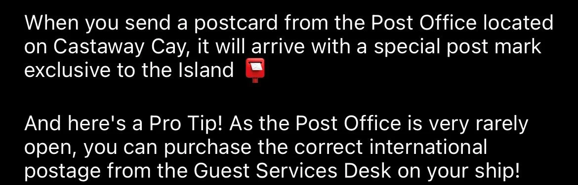 Letters mailed from either the island or the ship will be delivered with the Castaway Cay postmark