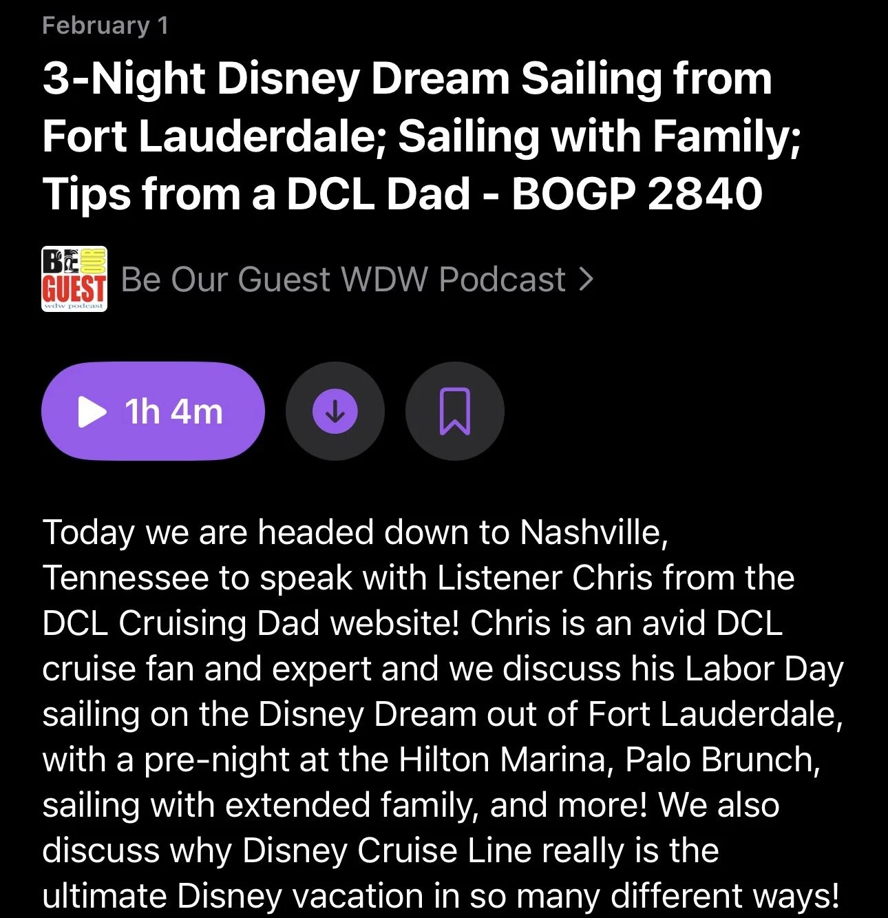Today we are headed down to Nashville, Tennessee to speak with Listener Chris from the DCL Cruising Dad website! Chris is an avid DCL cruise fan and expert and we discuss his Labor Day sailing on the Disney Dream out of Fort Lauderdale, with a pre-night at the Hilton Marina, Palo Brunch, sailing with extended family, and more! We also discuss why Disney Cruise Line really is the ultimate Disney vacation in so many different ways!