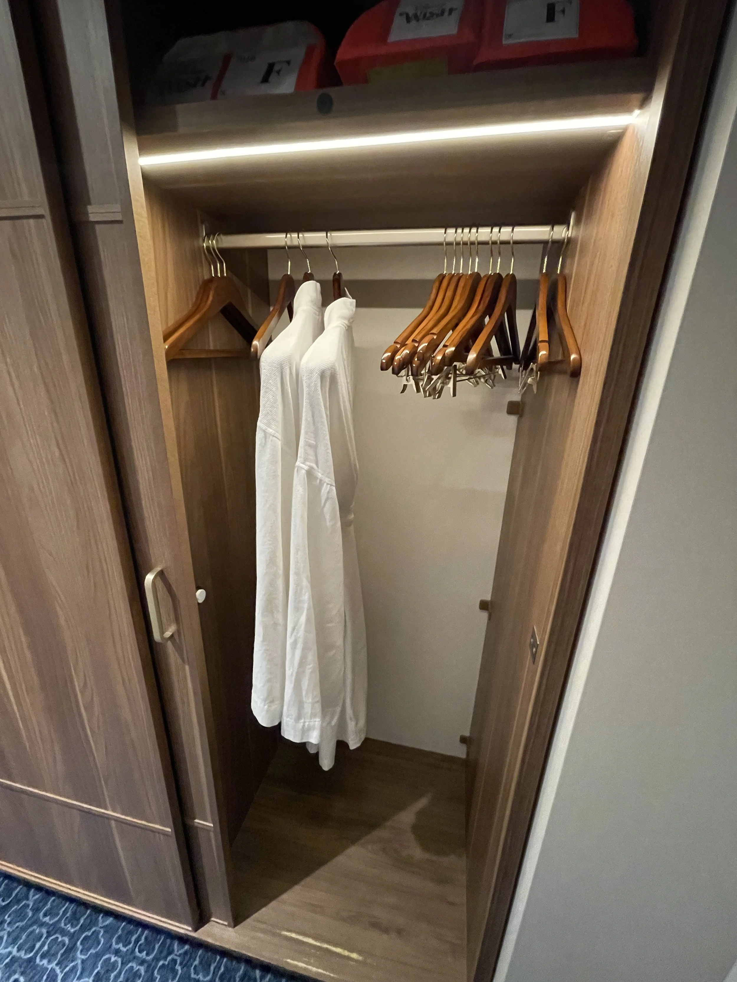 Room felt large enough for 4 – 5 people, extra chair with foot rest, dead space next to ottoman gives room for extra bags or shoes, no swivel on tv so hard to watch it on the couch and extra chair, plenty of wall space to hang magnets to hold lanyards, bags, hats, etc. (thanks to my wife Sara for that idea!). See photos below.