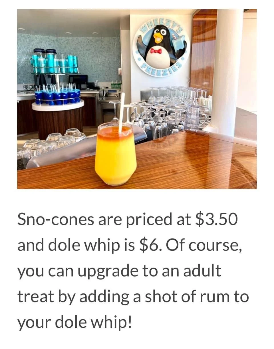 Wheezy’s Freezies Deck 12 FWDPoolside barHours 11 am to 5 pm Wheezy's Freezies Menu Treasure MArch 2025 May/June 2023 Sailing Photos Back To Quick service Main Page For Each Ship Disney Magic Quick ServiceDisney Wonder Quick ServiceDisney Dream Quick ServiceDisney Fantasy Quick ServiceDisney Wish Quick ServiceDisney Treasure Quick ServiceDisney Destiny Quick ServiceDisney Adventure Quick Service